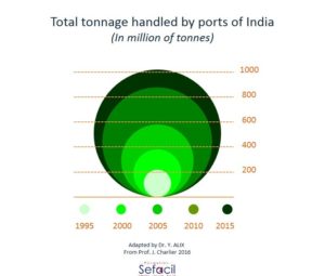 Toutefois, les côtes occidentale et orientale de l’Inde présentent un différentiel de croissance flagrant sur les 20 dernières années. Les ports de la côte orientale, incluant les plus grandes entités comme Madras ou Calcutta, se trouvent géographiquement éloignés des sillons maritimes les plus directs (dites routes orthodromiques) empruntés par les plus grands navires de commerce. Par conséquent, comme l’indique le Professeur Charlier, le Golfe du Bengale constitue un « cul de sac » maritime et portuaire malgré les très fortes concentrations de population sur le littoral.