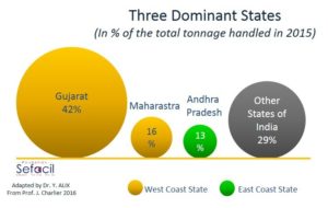 Si l’on ajoute les concentrations portuaires de Mumbai- Nhava Shiva, les deux provinces du nord-ouest du pays, Gujarat et Maharastra, pèsent pour 58% du total des manutentions nationales.