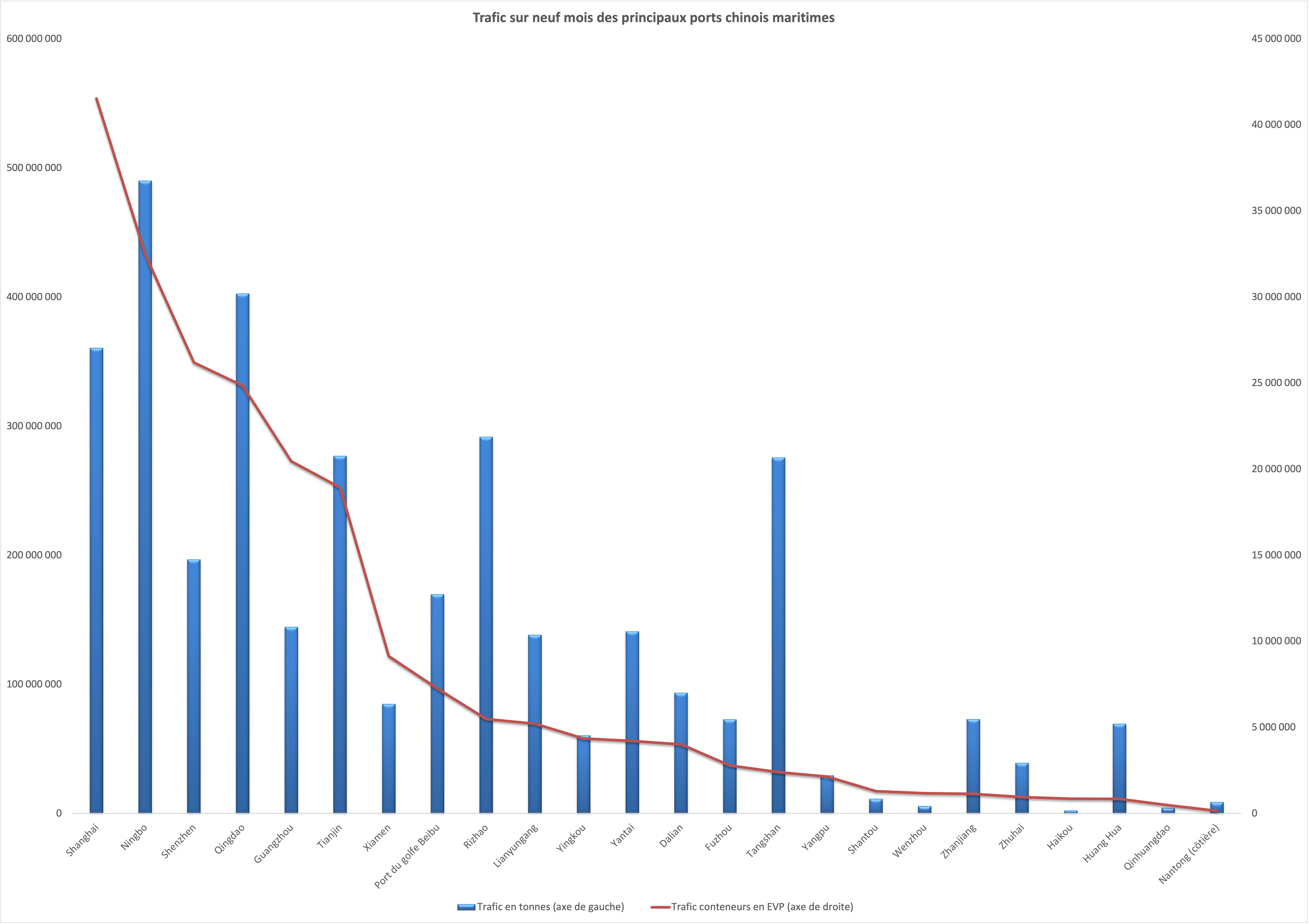 Ce chiffre de 4,1 Mdt regroupe ceux des ports maritimes et des ports fluviaux. Les trafics maritimes entrent à hauteur de 3,7 Mdt. Les 400 Mt supplémentaires sont réalisés par des ports fluviaux. Le premier port chinois en tonnage est celui de Ningbo. Situé au sud de Shanghai, l’ensemble portuaire constitué par les deux établissements de Ningbo et Zhoushan, sont actifs dans les conteneurs mais aussi les vracs secs et le pétrole. Des trafics qui apportent des volumes importants. Vient ensuite le port de Qingdao avec 402 Mt sur les trois trimestres. Un port qui traite notamment les entrées de minerais et de charbon pour l’économie chinoise. Enfin, la troisième marche du podium revient à Shanghai avec 360 Mt. Le port du centre de la Chine profite de sa position dans la conteneurisation.