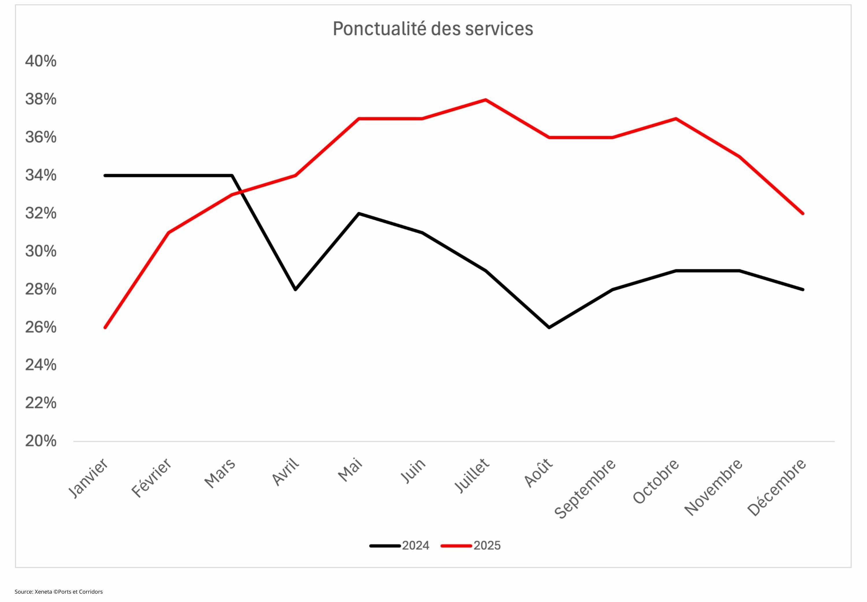 La ponctualité des services s’améliore. En 2025, 34% des navires respectent les horaires. Un taux qui était de 30% en 2024. « En isolant les scores bas du premier trimestre en raison de la recomposition des alliances, la moyenne pour 2025 atteint 36% », nuance les consultants.
