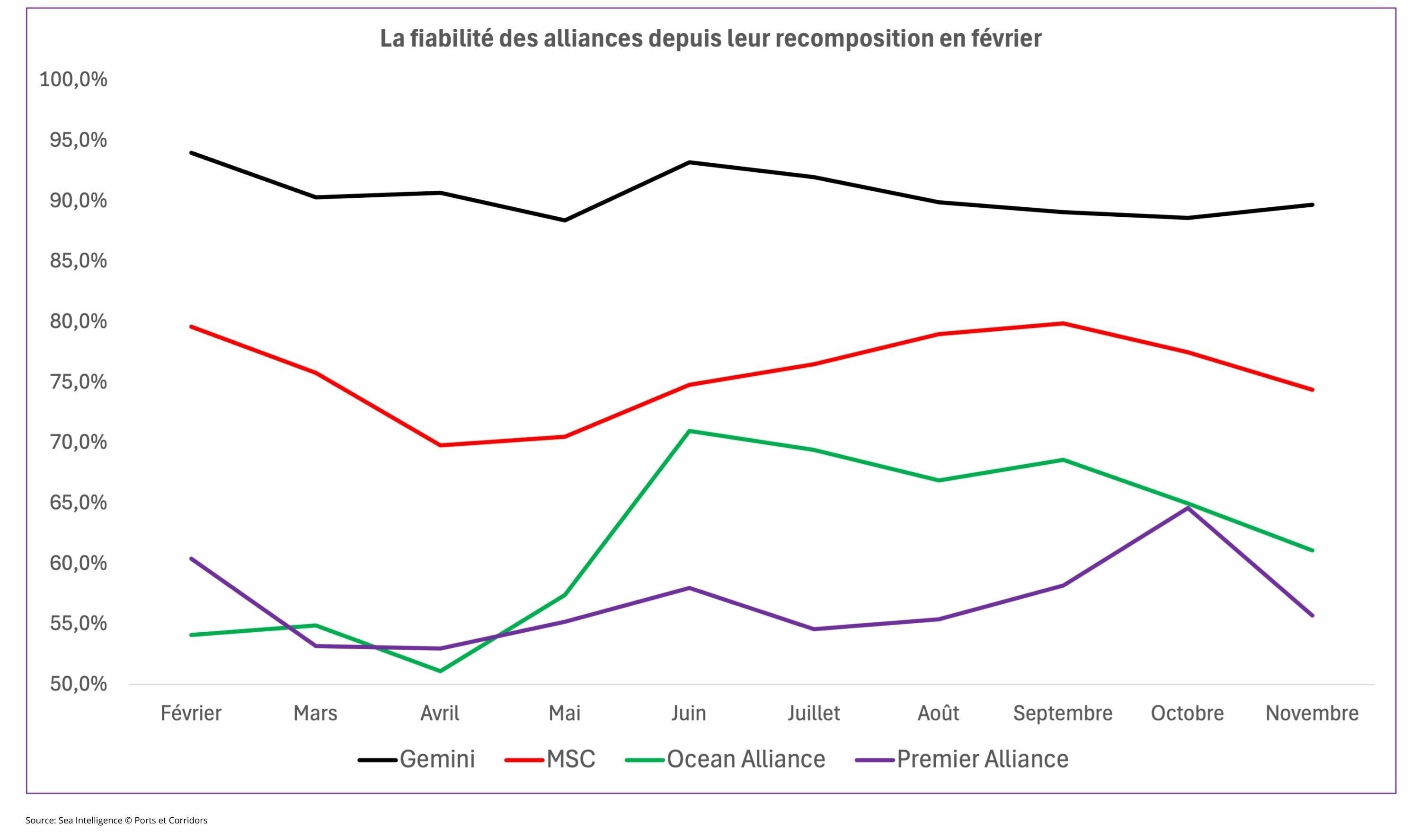 Si l’alliance Gemini réussi son pari d’une fiabilité avec un taux supérieur à 90%, les autres alliances peinent à atteindre un tel niveau. En effet, MSC, opérant désormais en cavalier seul sur les lignes Est-Ouest, affiche une moyenne de 75% depuis le mois de février au mois de novembre. L’armement basé en Suisse maintien sa stratégie vers un remplissage des navires avant de privilégier la ponctualité de ses services. Quant à la nouvelle Premier Alliance, regroupant Hyundai, Yang Ming et ONE, elle enregistre une fiabilité entre 50% et 65%. Ce dernier niveau est atteint en octobre avant un retour à 55% en novembre. Ocean Alliance, qui se compose de CMA CGM, Cosco, Evergreen et OOCL, peine à se maintenir aux environs de 70% de fiabilité. Enfin, hors Gemini, les alliances voient leur taux de fiabilité baisser depuis le mois de septembre. Des observateurs n’hésitent pas à plaider pour un système de hubs comme Gemini, pensant qu’il peut permettre un retour à la métronomisation des services maritimes.