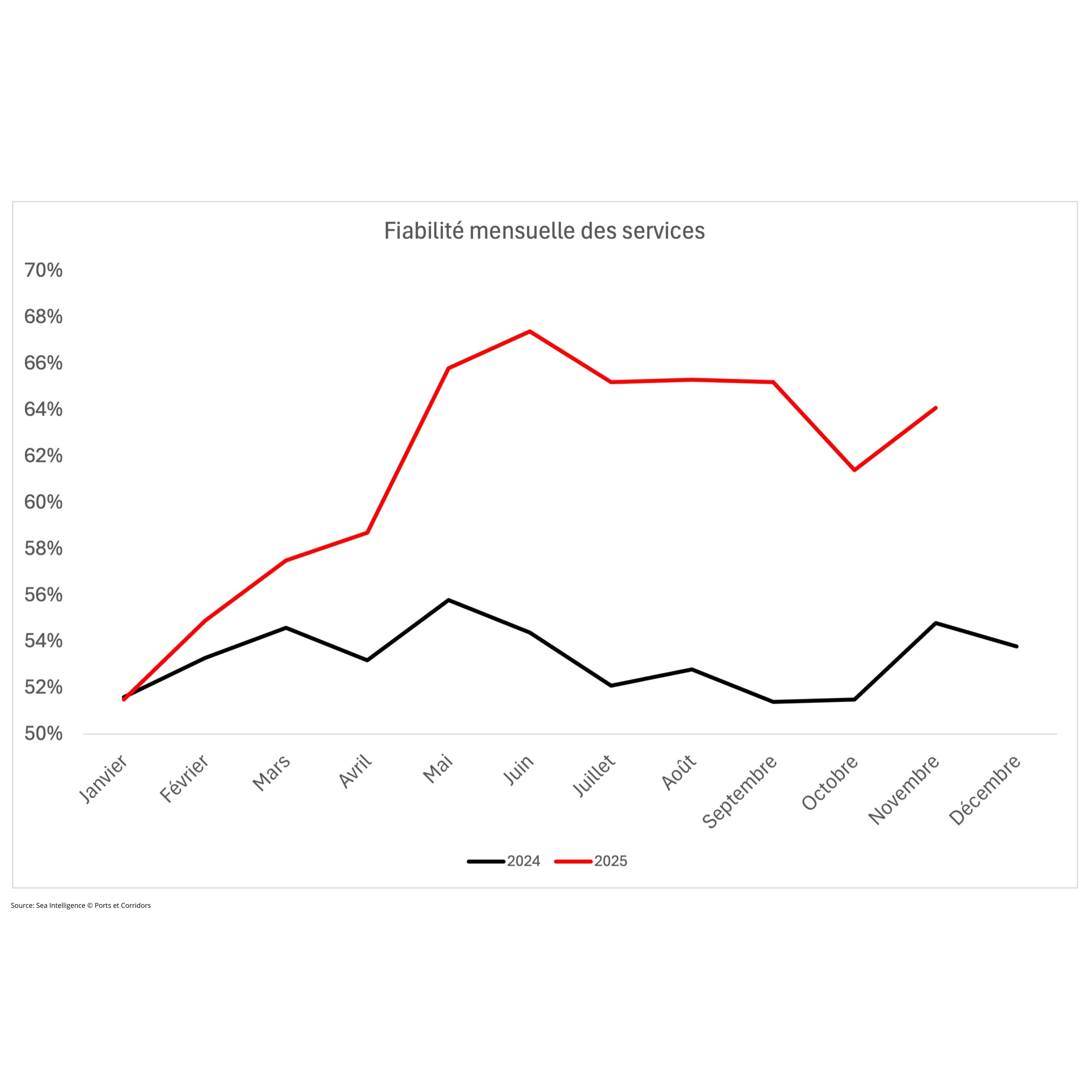 De son côté, Sea Intelligence publie chaque mois un rapport sur la fiabilité de 130 services. Sur les 11 premiers mois de l’année, le taux de fiabilité des services conteneurisés progresse. En moyenne, il se situe à 62%. Le chiffre reste encore éloigné des scores d’avant la pandémie. En effet, en 2019, la fiabilité des services a évolué entre 70% et 80%. Néanmoins, comparativement à 2024, elle s’améliore de neuf points. En 2024, les services ont enregistré une fiabilité de 53% en moyenne.